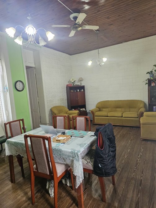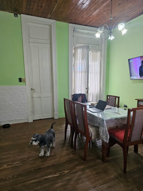 - Comedor de 4.30 x 6.30 metros con piso de madera y puerta pasante a patio.