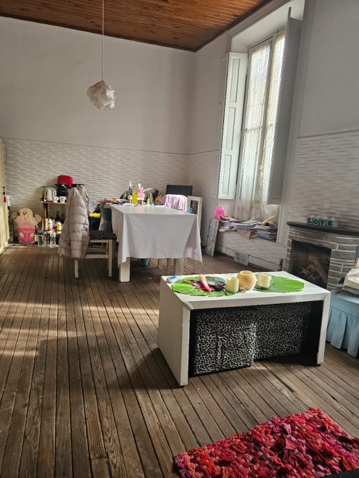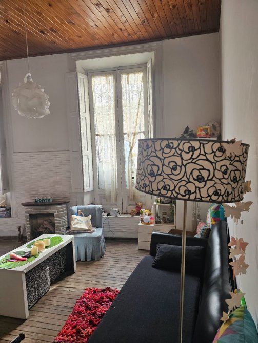 - Living de 6.50 x 4.30 metros con hogar a gas, piso de madera y ventanas con vista a la calle.