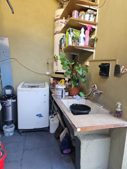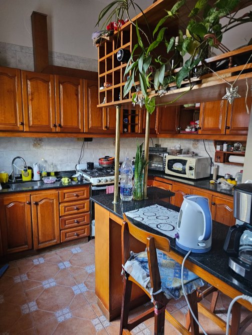 - Cocina comedor de 3.40 x 3.20 metros equipada con muebles bajo mesada, alacenas, barra desayunadora y puerta pasante a patio.