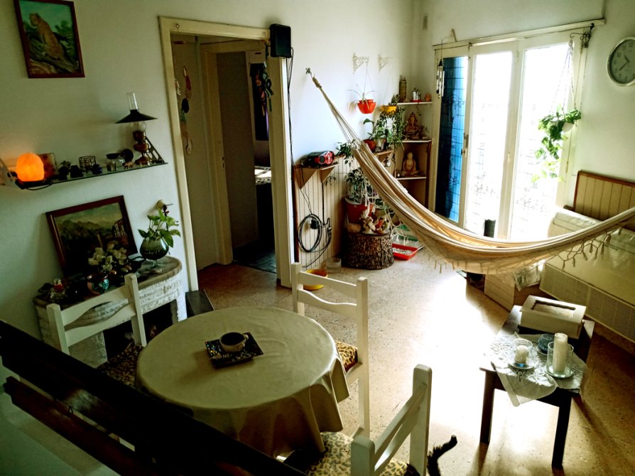 - Living comedor de 3.50 x 5.20 metros con hogar a gas, piso de granito, ventanal pasante a balcón y vista a la Avenida Debenedetti.