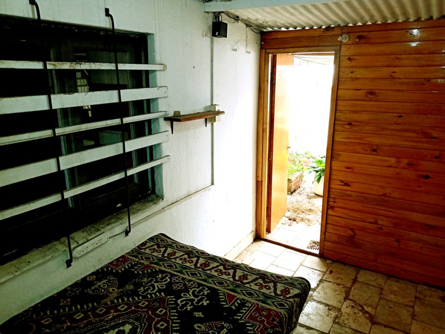 - Dormitorio de 3.50 x 2.70 metros con piso de granito y ventana con vista a terraza.