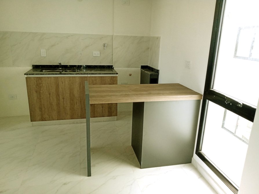 -Cocina moderna equipada con muebles bajo mesada y barra desayunadora, integrada al luminoso living-comedor.
