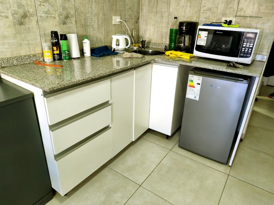 -Ambiente único con sector de cocina, que incluye mesada de granito, bacha simple de acero inoxidable y grifería monocomando. No se incluye artefacto de cocina.