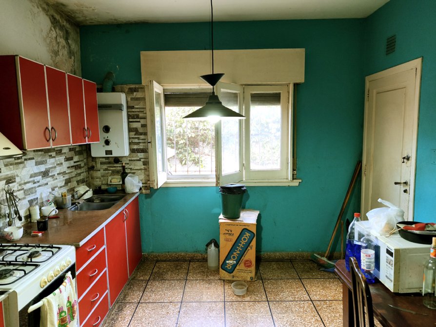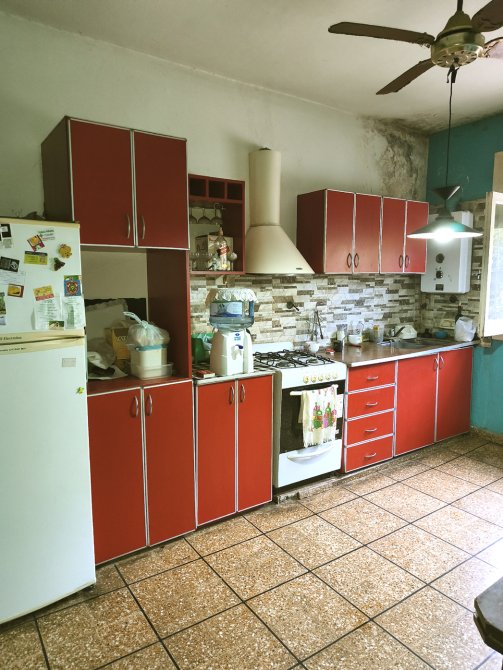 - Cocina de 4,20 x 3,40 m equipada con muebles bajo mesada y alacena, ventana con vista al patio trasero y salida directa al mismo.