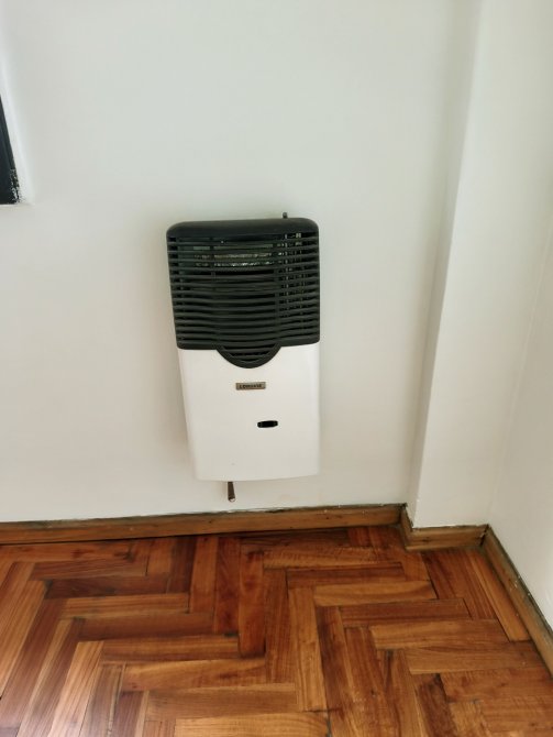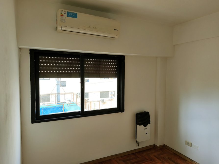 -Dormitorio de 2.90 x 3.90 m con piso de madera, placard empotrado, estufa de tiro balanceado, equipo de aire frío/calor, ventana con red de protección y vista a la piscina. El departamento cuenta con excelente iluminación natural y se encuentra en estado impecable, listo para habitar.