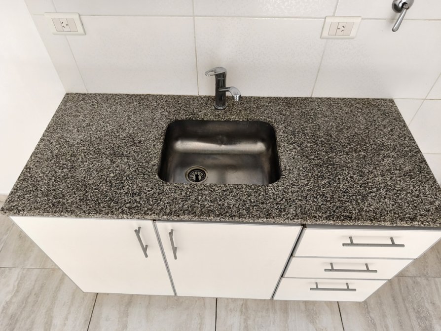 -Mesada de granito con bacha simple de acero inoxidable y grifería monocomando.