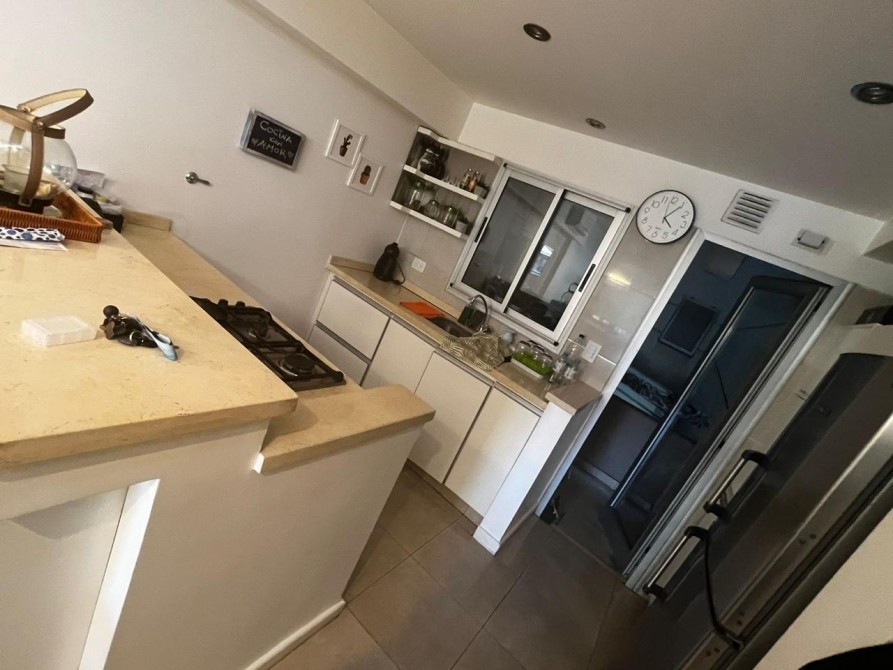 -Cocina comedor integrada, totalmente equipada con muebles bajo mesada, alacenas, isla central y horno empotrado