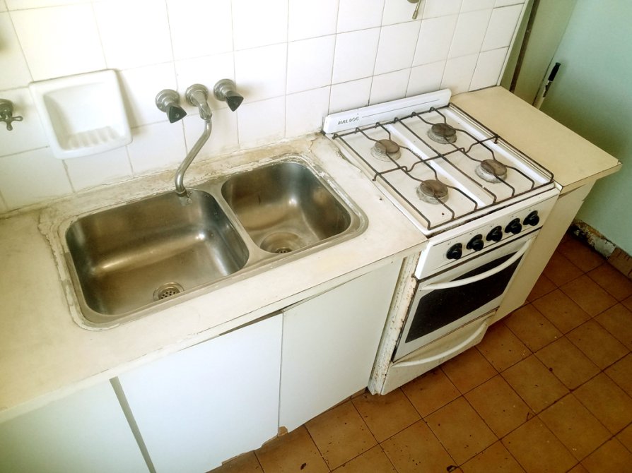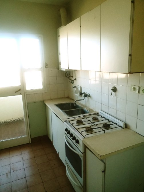 -Cocina de 2,70 x 1,70 metros con muebles bajo mesada, alacenas y puerta pasante a balcón.