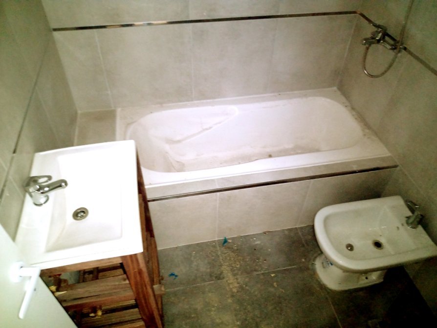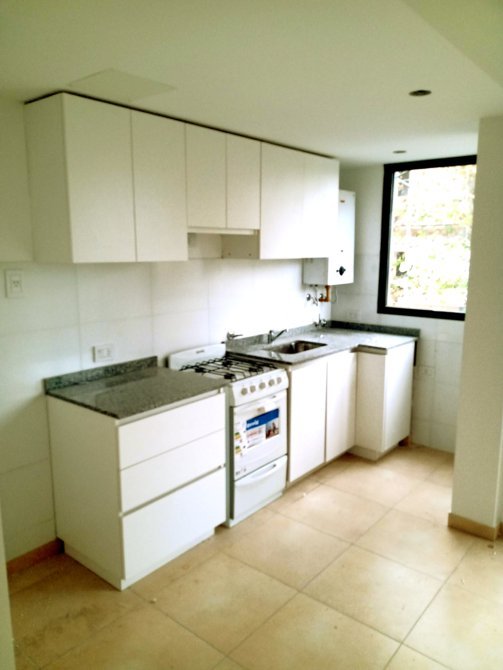 - Cocina comedor de 4.20 x 4.70 metros con muebles bajo mesada, alacenas, ventana con vista a la calle y la pre instalación para el lavarropas.