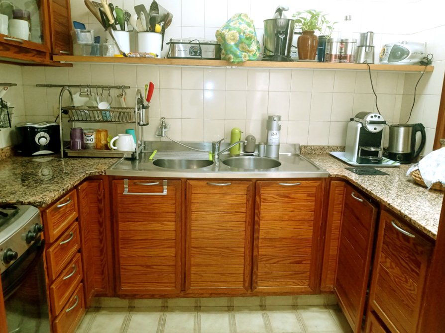 - Cocina: Funcional cocina de 2.70 x 3.50 m, equipada con muebles bajo mesada, alacenas, mesada con doble bacha y pasa platos. - Habitaciones: