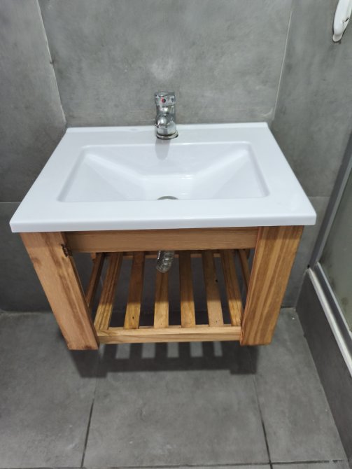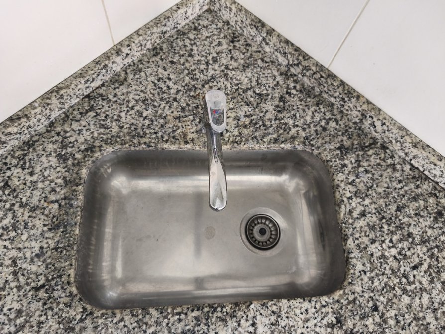 Mesada de granito con zócalo, bacha de acero inoxidable y grifería monocomando.