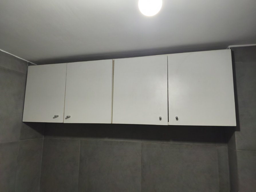 Muebles bajo mesada con 2 puertas y 3 cajones, alacenas con 9 puertas, espacios para horno eléctrico y microondas, y sector tipo bodega (4 unidades).