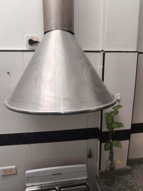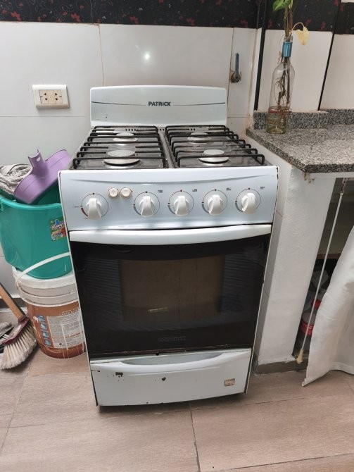 -Cocina independiente de 3 x 2,60 metros, equipada con mesada de granito gris, bacha simple con grifería monocomando, artefacto de cocina marca Patrick (4 hornallas, horno y parrilla), calefón Orbis y extractor de aire marca TST.