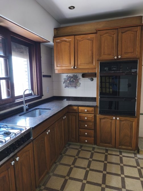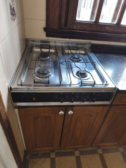 -Cocina independiente de 2.40 x 2.60 metros, equipada con mesada de granito, bacha simple con grifería, muebles bajo mesada (8 puertas y 5 cajones), alacenas (4 puertas), horno empotrado y cocina de 4 hornallas marca Domec.