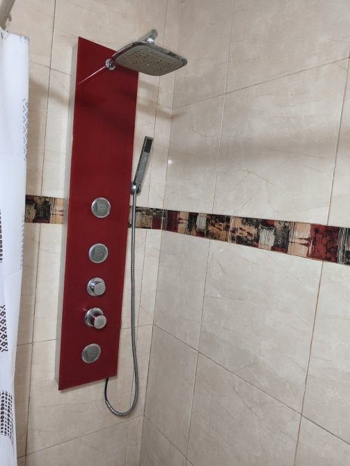 -Baño completo con vanitory con mesada de mármol oscuro, bacha simple, espejo, ducha escocesa y luminarias.