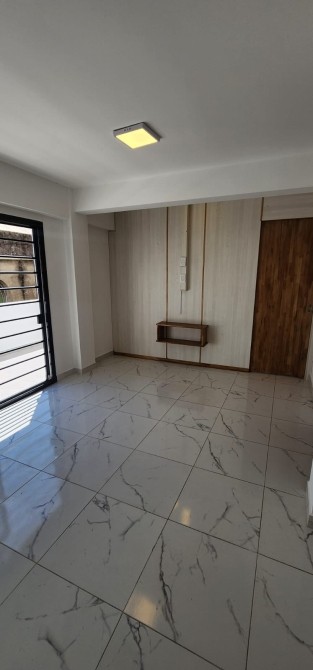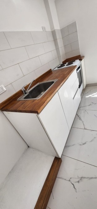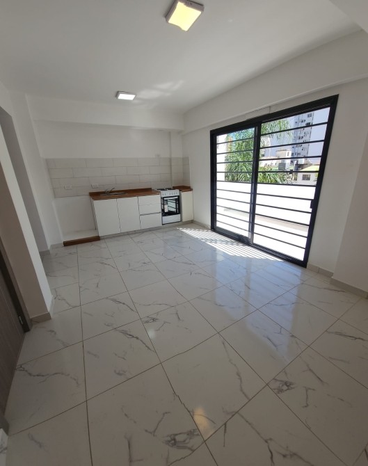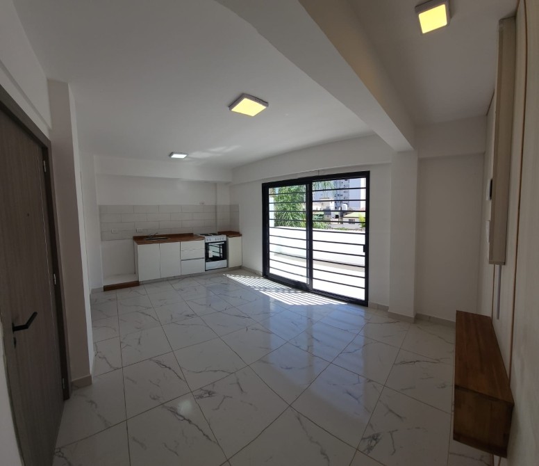 -Cocina integrada al living-comedor, con dimensiones de 3.60 x 5 metros y ventanal que da acceso al balcón. La cocina está equipada con muebles bajo mesada y un artefacto de cocina eléctrico.