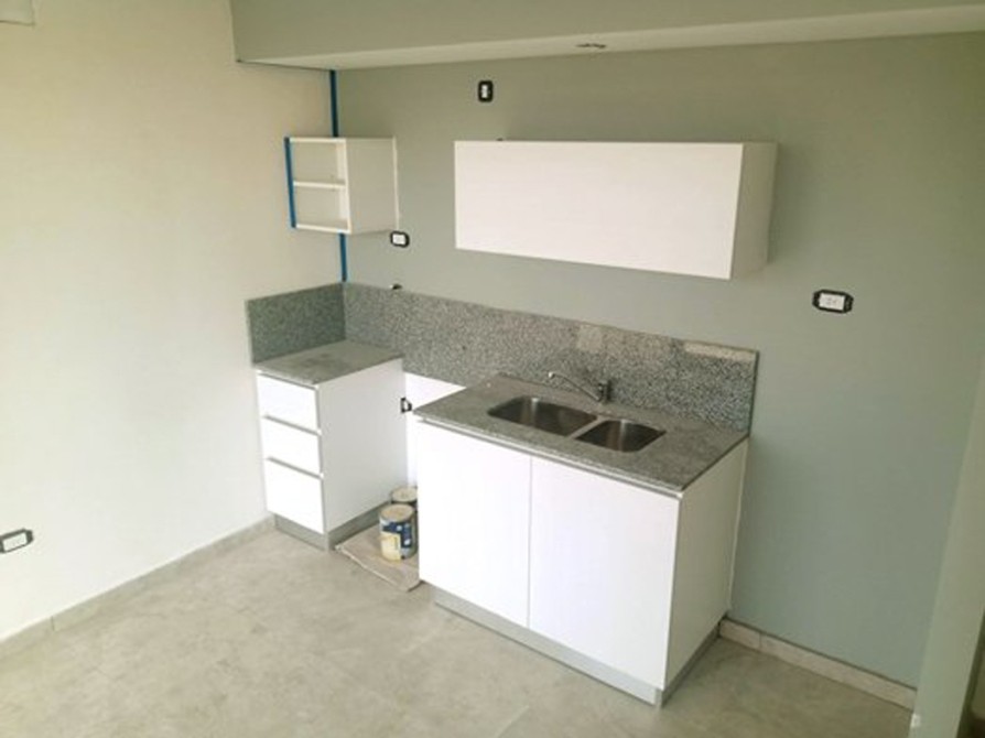 -Cocina-comedor de 3,80 x 3,50 m, equipada con muebles bajo mesada, alacenas y ventanal con salida al balcón.